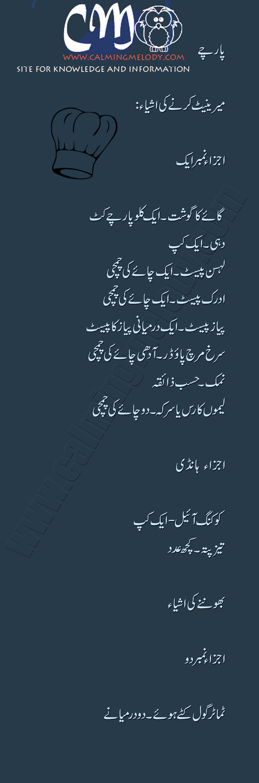 پارچے پاکستان کی بہت پرانی اور مشہور ڈش ہے۔ پارچے ہلکے مصالحے میں پائے جاتے ھیں۔ مگر کھانے میں انتیہائی لذیذ ہوتے ہیں۔ ان کو دہی ، سلاد اور نان کے ساتھ تناول فرمائیں۔پارچے بنانے کے لیئے پہلے سے گوشت کو پارچے کٹ میں کٹوا لیں۔ اور کانتے یا چھری کی مدد سے گود لیں۔